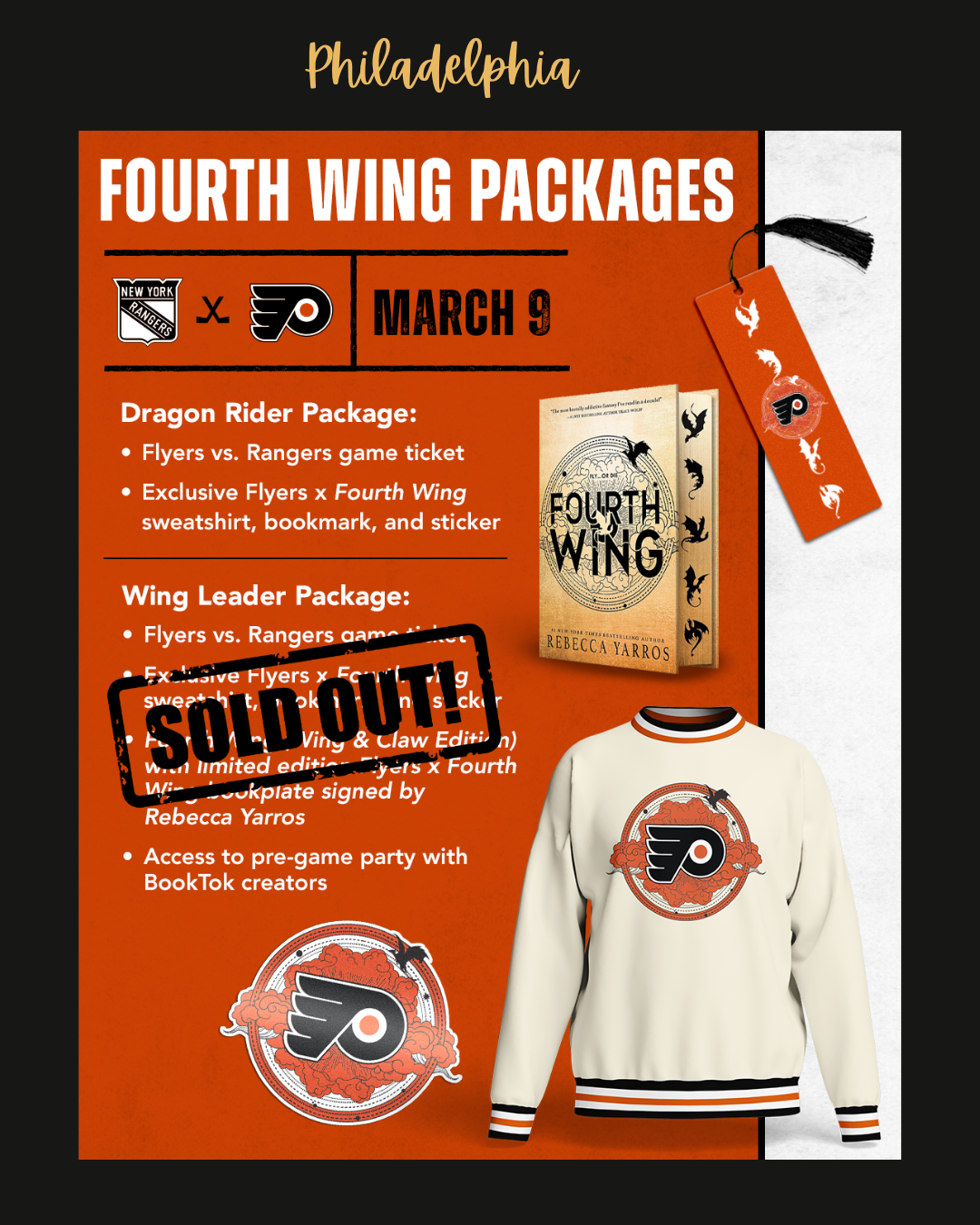 Fourth Wing Night at Ball Arena in Denver, CO is on April 8! Tickets will go on sale Friday, December 12 at 10 am MT (12 pm ET / 9 am PT). You can click the link below to see more about the event and what the ticket packages include, and to sign up to receive the ticket link the day of the sale.